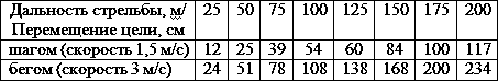 Пример. Для получения упреждения в 2 м при стрельбе на 500 м по перебегающим целям точку прицеливания выносить: при движении