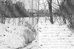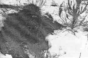 Рукавицы на руках и маска на лице обязательны - они предохраняют от обморожения. Кроме того, маска сдерживает пар от дыхания. Этот пар выдал и погубил уже не одного стрелка. Длинный нижний край матерчатой маски заправляется под широкий воротник, и пар от дыхания этим "хоботом" направляется "под шкуру" и дополнительно обогревает снайпера. Куртка, маскхалат и штаны снайпера не должны быть тесными - они должны быть на номер-два шире обычной одежды и обеспечивать свободу движений снайпера в лежачем состоянии. В обширной одежде непроизвольные телодвижения, неизбежные на морозе, не так заметны со стороны, к тому же в просторной одежде теплее. Зимние позиции снайпера могут быть открытыми и закрытыми. Открытые позиции, то есть ничем не защищенные и не закрытые сверху, занимаются снайпером на то время, которое он может выдержать на морозе. Обычно это запасные позиции и позиции подскока для выжидания появления цели, мгновенного ее поражения и быстрого исчезновения с этой позиции, не дожидаясь, пока ее накроют минометным огнем. Открытые позиции носят временный характер, но это не значит, что их не надо подготавливать и выбирать место для них. Посмотрите на фото 154. Снайпер очень грамотно выбрал и подготовил открытую временную позицию для поражения целей на объекте, расположенном со стороны условного противника на дистанции 350 метров. Позиция снайпера расположена на окраине леса. Впереди позиции находится редкий кустарник. Снайперу (и фотографу, делавшему снимок) этот редкий кустарник не мешает видеть объект и то, что делается на нем, потому что кустарник расположен от позиции близко. Но стоит отойти хотя бы метров на сто и посмотреть на позицию со стороны противника, как все, что находится за этими редкими кустиками со стороны позиции, перестает быть различимым Кроме всего прочего, дым от выстрела рассеивается за стеной кустарника и поэтому не виден снаружи. Это так называемый "эффект тюлевой гардины" - из помещения из-за гардины видно все, а с улицы за гардиной - ничего. Но даже в этом случае снайпер старается зарыться поглубже в снег и лишний раз не подставляться. В данном случае снег был неглубокий, и снайпер не мог в него закопаться, поэтому он нагреб бруствер спереди и с боков (фото 155). Спереди снайпер капитально покропил водой бруствер и пространство на 2-3 метра перед ним для того, чтобы образовалась ледяная корочка и сухой снег не поднимался при выстреле пороховыми газами (фото 156). Снежный вихрь, взметенный после выстрела, поднимается довольно высоко и очень наглядно показывает противнику место, откуда этот выстрел был произведен.