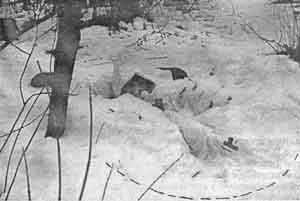 Довольно быстро образовалось весьма уютное логово, в котором можно было си деть. После того как входной лаз завесили старым немецким мешком из хозяйства этого знающего инструктора, внутри позиции вдруг стало необычайно тепло по сравнению с -20°С, которые были снаружи. К тому же там не было ветра. После того как старик зажег огарок свечи и поставил его в углу таким об разом, чтобы огонь не был виден из амбразуры снаружи, можно было снять рукавицы, шапку и расстегнуться. Инструктор объяснил все это тем, что воздушная подушка, образованная толстым хвойным перекрытием, очень хорошо держит тепло. К тому же, как он сказал, "огонек свечи делает человеку теплее на душе", а от этого становится теплее всему организму. По его словам, имея пару свечей, на такой позиции можно было продержаться сутки при самых жутких морозах. В довершение ко всему дед капитально полил укрытие водой снаружи, превратив его в ледяной дот. По тому, как быстро и сноровисто он все это делал в сгущающихся сумерках, автор понял, что свои 10 лет лагерей этот неразговорчивый человек получил недаром. Довольно часто снайперам приходится подползать к противнику и работать по заранее разведанной цели с подскока, без подготовленной прежде позиции, и сразу исчезать по принципу "укусил и скрылся". Для этого приходится кратковременно "возникнуть". Чтобы возникнуть незаметно, надо не выделяться на фоне местности, а для этого снайперу необходимо все время крутить головой и контролировать фон, который находится за ним. На фото 161 снайпер этого не сделал и в белом маскхалате возник на черном фоне, к тому же на ровном гребне высокого места. Он стал заметен, и за те 3-4 секунды, необходимые ему для выстрела, его могут "снять" самого.