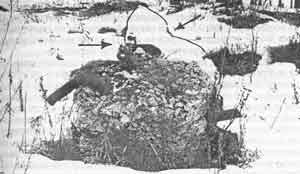 Если у снайпера есть возможность, он не только кропит, но и поливает водой бруствер перед собой и по бокам от себя. После этого позиция заледенеет и будет предохранять хозяина от пуль и осколков. Так делали немцы, которые не любили менять позиции и стреляли с них длительное время. Наши достать их не могли из-за отсутствия маневренных минометов малых калибров. Русские снайперы предпочитали мерзнуть до упора, зарывшись по возможности поглубже в снег, и после одного-двух выстрелов "сваливали" с позиции, не дожидаясь, пока немцы накроют ее минометным огнем. Небольшие минометы типа "поднос" у немцев были в каждом взводе. Разные возможности - разная тактика. Но в любом случае и наши, и немецкие, и финские снайперы оборудовали закрытые утепленные основные позиции, на которых приходилось находиться долго - и для выслеживания противника, и для наблюдения. Как это можно сделать? Старый финн, живущий под Ленинградом (ныне Санкт-Петербург) и отсидевший в свое время при Сталине 10 лет за участие во Второй мировой войне "не на той стороне", показал автору простой и доступный всем способ оборудования закрытой снайперской позиции с помощью подручных средств, всегда имеющихся в средней климатической полосе. Короткой пилой старик срезал сосенку (не елочку - у сосны иголки держатся очень долго, а у ели они опадают сразу). Затем он отрезал у комлевой части узел-звезду, из которого росли ветви в разные стороны. Старик перевернул отрезанный фрагмент сосны сверху вниз и поставил его на снег в таком виде. Получилось готовое перекрытие, как каркас у зонтика (фото 157). Снега было мало, и старик поставил этот каркас на старый окоп, оставшийся с прошлой войны. С той же сосенки были нарезаны ветви, и этим "лапником" дед искусно заложил и переплел толстые ветви каркаса (фото 158). Потом начал забрасывать все это снегом. Окоп начал исчезать на глазах (фото 159) и вскоре вообще сравнялся с ландшафтом. Для обзора и обстрела была проделана амбразура, в которую выставлялась винтовка (фото 160) (для наглядности фотографирования ствол бинтом не маскировался).