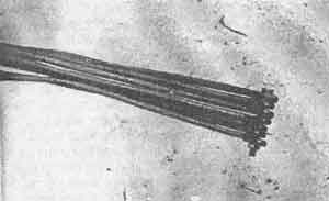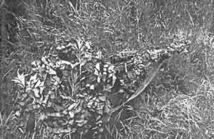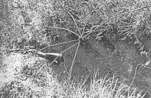 Поэтому основные снайперские позиции в позиционной войне оборудуются по закрытому типу. Ночью снайпер выкапывал на ничьей полосе поближе к противнику окоп, землю от которого относил на полотнище подальше и маскировал Окоп накрывался сверху проволочным каркасом. Обычно снайперы изготовляют простейший каркас типа "паук", он состоит из нескольких отрезков мягкой проволоки с загнутыми в петли концами, которые соединены винтом и гайкой (фото 174). Другие концы загнуты вниз, чтобы можно было воткнуть их в землю и этим зафиксировать конструкцию. Такой каркас складывается (фото 175) и поэтому удобен для переноски. В раскрытом виде каркас устанавливается над окопом (фото 176). На каркас накидывается "лохматый" камуфляж, который присыпается сверху тем, что есть на местности, - листьями, сухой травой, хвоей, соломой и т. д. После чего позиция снайпера практически сливается с окружающим ландшафтом и не выделяется на нем (фото 177-179). Такие позиции маскируются под кочки, рытвины, кучи листьев, мусора, а при расположении позиции на скате, обращенном к противнику, вообще под ровное место. Позицию всегда стараются выбрать на ровном месте, подальше от приметных ориентиров, привлекающих внимание, расстояние до которых наверняка вычислено противником.