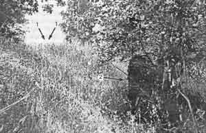 Фото 172. На предыдущей фотографии снайпер находился на позиции, указанной стрелками 1 Сейчас он находится в глубине растительности ниже по скату. Его позиция указана стрелкой 2 Для наглядности он выдвинулся из-за куста, иначе в лохматом камуфляже он был бы невидим вообще