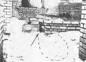 Фото 189. Стрелкой показана позиция снайпера в глубине развалин. Пунктиром обозначено место, на котором снайпер окропил снег водой