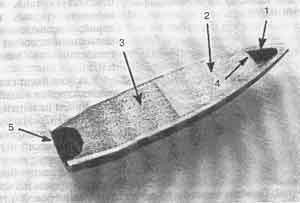 1 - пустой баллистический наконечник; 2 - стальной сердечник; 3 - свинцовая заливка; 4 - скос сердечника; 5 - полый хвостовик