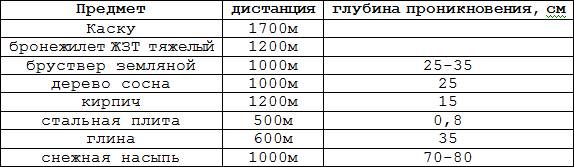 Благодаря стальному сердечнику пули патронов "снайперские" имеют бронепробиваемость на 25-30% выше, чем обычные легкие пули. Пули данного вида боеприпасов имеют обтекаемую форму тяжелой пули образца 1930 г, но вес, равный весу легкой пули, - 9,9 г благодаря стальному сердечнику и пустоте в хвостовой части. Так было специально задумано разработчиками для придания легкой пуле полезных качеств пули тяжелой. Поэтому траектория полета пули патронов "снайперские" соответствует табл. 8 превышения средних траекторий, приведенной в настоящем пособии и наставлении по винтовке СВД.