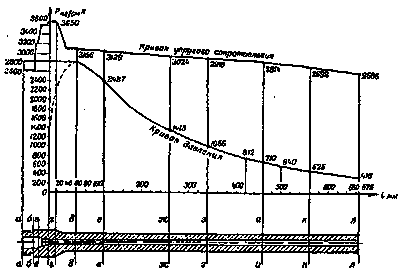 Разделим ствол на ряд участков и совместим его под графиком изменения давления внутри ствола при выстреле (схема 144). Над кривой давления расположим математически рассчитанную согласно сопротивлению материалов кривую упругого сопротивления ствола давлению внутри него. Мы получим картину сопротивления стенок ствола в различные периоды выстрела.