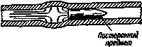Ствол, работающий в экстремальных условиях, очень подвержен раздутию. Причиной раздутия служит попадание в ствол крупных частичек песка, комков грязи, снега, оставление в стволе смазки или волокон ветоши после чистки. Механизм раздутия следующий: пуля при выстреле движется по стволу, и толкающие ее пороховые газы движутся вплотную к ней с той же скоростью. Когда пуля, натолкнувшись на препятствие, "притормаживает", даже незначительно, пороховые газы отражаются назад от донной части пули, и эта обратная волна встречается с основным потоком газов. На месте встречи этих газовых потоков возникает область повышенного давления, которая и раздувает ствол в стороны (схема 148). Если препятствие небольшое, пуля преодолевает его и выбрасывается из ствола. Если препятствие непреодолимо, возникшая область повышенного давления разрывает ствол. По этой причине ствол запрещается закрывать или затыкать чем-либо.