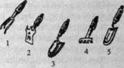 | Рис. 12. Мелкий садовый инвентарь: 1 —полольник; 2 —ручная мотыга; 3 — широкий совок; 4 —ручные грабли; 5 — узкий совок |