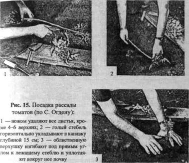 Рассаду высаживают в лунки наклонно, чтобы нижняя часть стебля была присыпана землей. Если рассада сильно вытянута, можно почти горизонтально закопать стебель до половины. На закопанной части стебля образуются придаточные корни, и это только улучшит питание растений. В конце мая рассаду высаживают под пленку для защиты от холодных низких ночных температур, а после 7 июня можно высадить в открытый грунт. Рассаду ни в коем случае нельзя высаживать в холодную почву; поэтому за три недели до высадки на грядке делают неглубокую траншею вдоль будущего ряда