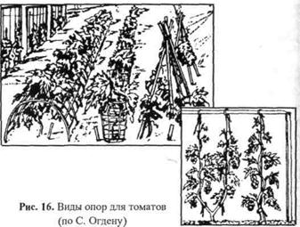 Сорта томатов делятся на д в е группы. Кустовые томаты, или детерминантные, имеют ограниченный рост, среди них преобладают скороспелые сорта. После того как на растении образуется определенное, характерное для сорта количество ветвей и соцветий, они перестают расти. Высокорослые томаты, их даже относят к вьющимся растениям, растут вверх неограниченно, образуя до самых заморозков новые ветви и соцветия. Кустовые томаты обычно выращивают в открытом грунте, высокорослые — в теплице. Кустовые томаты нуждаются в подвязке к колышкам или опоре в виде проволочной клетки, которые поддерживают тяжелые гроздья плодов, не давая им упасть на землю. Высокорослые томаты подвязывают толстым шнуром к перекладинам под крышей теплицы. Шнуром обвязывают стебель у основания. В дальнейшем гибкий стебель обвивается вокруг шнура и тянется вверх.
