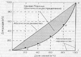 Для графической иллюстрации степени неравномерности в распределении доходов строится кривая Лоренца (рисунок 13.4), которая показывает соотношение процентов всех доходов и процентов всех получателей. Степень неравенства доходов определяется областью между линией, обозначающей идеальное равенство, и кривой Лоренца. Неравномерное распределение характеризуется кривой Лоренца, т.е. линией фактического распределения, отстоящей прямой тем дальше, чем больше дифференциация доходов.