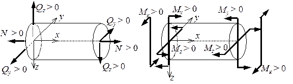 Сложное сопротивление – такой вид деформации, при котором в стержне могут возникнуть все шесть видов внутренних усилий одновременно. Эти усилия определяются, как обычно, методом сечений. При построении эпюр внутренних усилий правила знаков для продольной силы и крутящего момента используем те же, что и раньше. Для изгибающих моментов принимается другоеправило знаков, а именно: изгибающий момент считается положительным, если он вызывает растягивающие напряжения в положительном квадранте (т. е. в том квадранте, где координаты