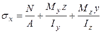 От действия всех внутренних усилий в поперечном сечении стержня возникают нормальные и касательные напряжения. Нормальные напряжения связаны с действием продольной силы и изгибающих моментов и определяются в любой точке поперечного сечения[1] по формуле