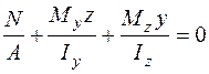 При расчете конструкций нас, как правило, интересуют максимальные напряжения. Точки, в которых они действуют, называются опасными. Для определения положения опасных точек с максимальными (растягивающими или сжимающими) нормальными напряжениями надо построить нейтральную линию и найти точки, наиболее удаленные от нее. Напомним, что нейтральной линией называется линия, на которой нормальные напряжения равны нулю. Для построения нейтральной линии запишем ее уравнение, приравняв напряжения в формуле (5.1) нулю: