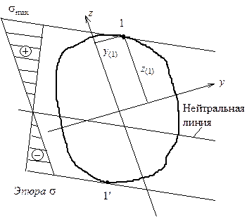 В уравнении (5.2) y и z – координаты точек, принадлежащих нейтральной линии. Построив по уравнению (5.2) нейтральную линию, проведем прямые, касательные к контуру сечения и параллельные нейтральной линии. Точки касания этих прямых контура сечения и являются опасными точками, в которых действуют максимальные нормальные напряжения. Рис. 5.2 поясняет описанное построение для сечения произвольной формы. Показанная на рис. 5.2 эпюра нормальных напряжений соответствует положительным значениям усилий в уравнении (5.2). Максимальное напряжение действует в точке 1, именно эта точка и будет опасной. Для определения нормальных напряжений в этой точке подставим в формулу (5.1) координаты