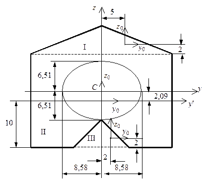 – ось симметрии фигуры (рис. 5.18) – является главной осью инерции. Найдем положение второй главной центральной оси, определив положение центра тяжести фигуры. Очевидно, что центр тяжести лежит на оси симметрии, поэтому найдем только координату