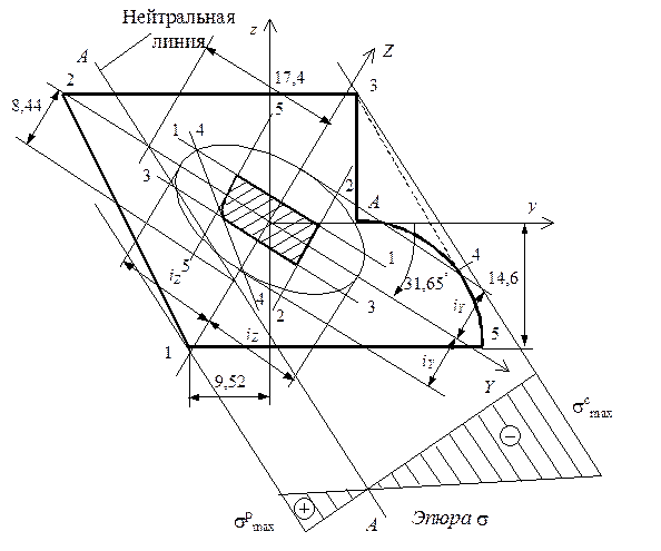 Для определения положения опасных точек построим нейтральную линию, используя формулы (5.12). Радиусы инерции