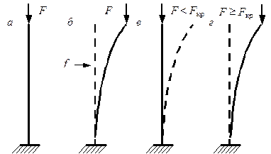 Положение равновесия стержня может быть устойчивым, неустойчивым и безразличным. Чтобы на опыте выявить, каким является равновесие стержня, надо вывести его из положения равновесия, приложив к стержню кратковременную малую возмущающую нагрузку, и посмотреть, как будет вести себя стержень после снятия возмущения. Рассмотрим центрально-сжатый стержень (рис. 6.1, а). Приложим к нему возмущающую нагрузку (сила f на рис. 6.1, б). При действии возмущающей нагрузки рассматриваемый стержень изогнется. Если после снятия возмущения стержень возвращается в исходное прямолинейное состояние, то это состояние называется устойчивым. Если же после удаления возмущающей нагрузки стержень остается в изогнутом состоянии, то первоначальная прямолинейная форма равновесия является неустойчивой. Нагрузка, при которой первоначальная форма равновесия становится неустойчивой, называется критической. Рис. 6.1, в, г поясняют данное определение критической силы. Если нагрузка меньше критической силы (см. рис. 6.1, в), то после прекращения действия возмущающей нагрузки стержень остается прямолинейным. Если же нагрузка достигла критической величины или стала больше (см. рис. 6.1, г), то стержень после снятия возмущения остается в изогнутом состоянии. Поскольку на практике всегда бывают какие-то возмущения, то при достижении силой критического значения сжатый стержень начинает изгибаться. Описанное явление носит название потери устойчивости центрально-сжатого стержня. Условие, обеспечивающее определенный запас против потери устойчивости стержней конструкции, называется условием устойчивости. Студент должен: