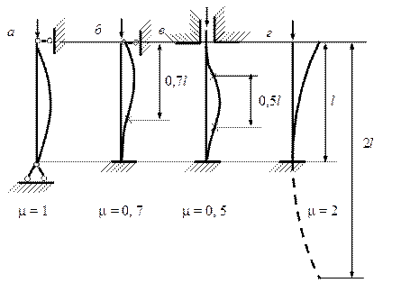 для четырех видов закреплений стержней. На этом же рисунке показаны изогнутые оси стержней в момент потери устойчивости. Для запоминания величины коэффициента