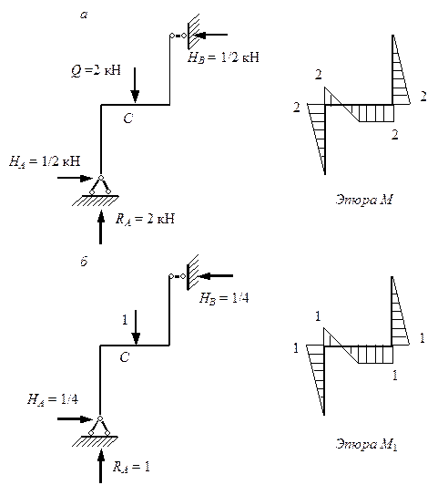 точки С (точки приложения нагрузки Q) от статического действия нагрузки. Найдем этот прогиб, используя метод Максвелла – Мора и интегрируя формулу Максвелла – Мора с помощью правила Верещагина. Для этого построим эпюры изгибающих моментов от нагрузки Q (рис. 7.6, а) и от единичной силы, соответствующей искомому перемещению (рис. 7.6, б). Перемножим эти эпюры по правилу Верещагина: