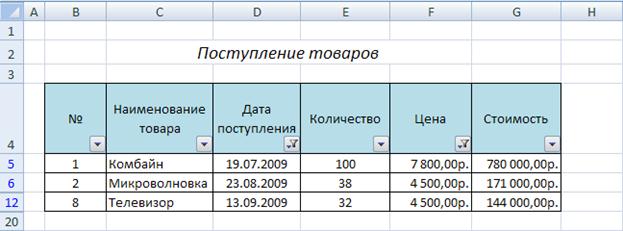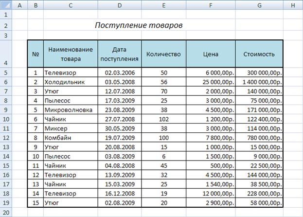 2. Для столбца Дата поступления установите формат ячеек – Дата, для столбцов Цена и Стоимость – Денежный формат.