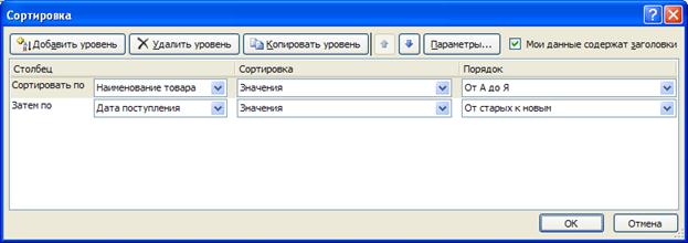 · выберите сортировать по Наименованию товара, затем добавьте новый уровень сортировки по Дате поступления (рис. 35).