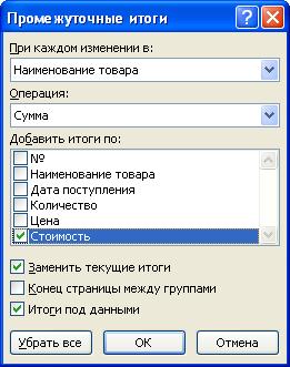 · в появившемся диалоговом окне укажите операцию суммирования по столбцу Стоимость и нажмите кнопку ОК (рис. 36).