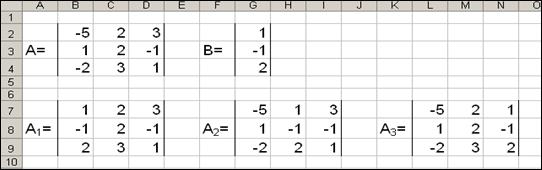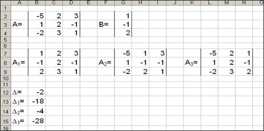 Найдем определители D, D1, D2, и D3, используя математическую функцию МОПРЕД (рис. 44).