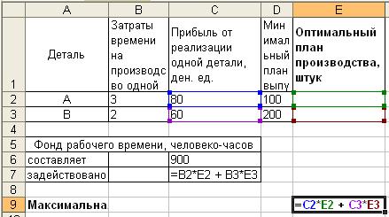В качестве переменных х1 и х2 будем использовать ячейки E2 и E3 соответственно. Для значения целевой функции будем использовать ячейку E9: