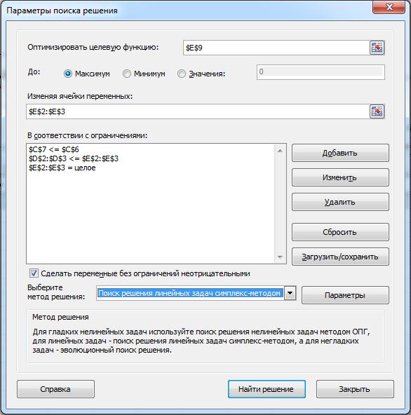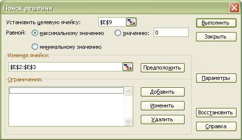 Перед нами открывается диалоговое окно Поиск решения. В нём указываем, что нам необходимо установить ячейку $E$9 максимальному значению, изменяя ячейки $E$2:$E$3. Далее нажимаем кнопку Добавить для добавления ограничений. И добавляем следующие ограничения: