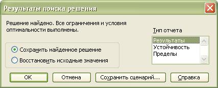 Нажимаем кнопку Выполнить. И перед нами открывается диалоговое окно Результаты поиска решения: