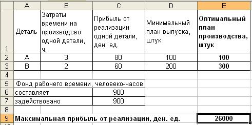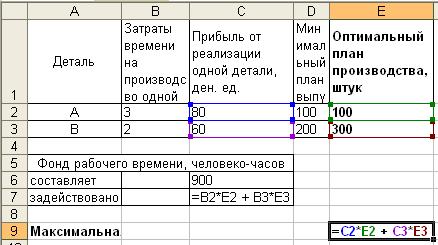 | $E$9 | Максимальная прибыль от реализации, ден. ед. Оптимальный план производства, штук | |||||