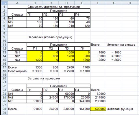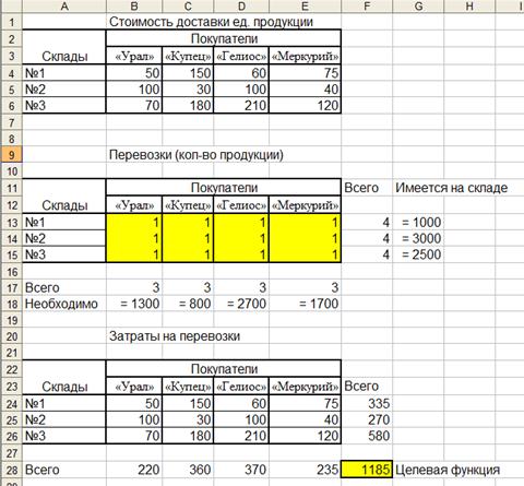3. Целевая функция в данном случае вычисляется по формуле =СУММПРОИЗВ(C6:F9;C15:F18).