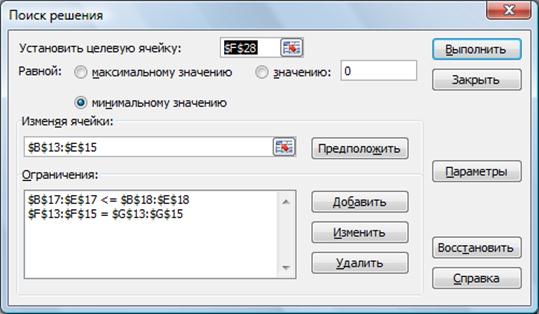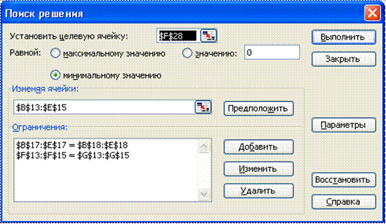 8. В появившемся диалоговом окне Поиск решения укажите адреса целевой ячейки, диапазон изменяемых ячеек и ограничения (рис. 50). Целевую ячейку установите равной минимальному значению.