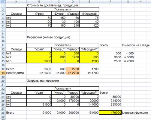 Пример 2. Компания «Атлант» хранит свою продукцию на трех складах (первом, втором и третьем), расположенных в разных частях города. На этих складах хранится продукция в количествах 1000, 3000 и 2500 штук соответственно. Продукцию необходимо доставить четырем оптовым покупателям «Урал», «Купец», «Гелиос» и «Меркурий» с минимальными затратами, заявки которых составляют 1300, 800, 2700 и 1700 штук соответственно. Склады оптовых покупателей также расположены в разных частях города. Стоимости (в рублях) доставки одной штуки продукции со складов компании на склады покупателей показаны в следующей таблице.