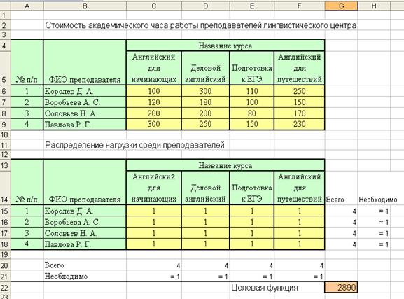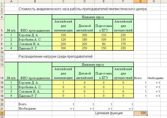 Пример 3. В лингвистическом центре работают 4 преподавателя по следующим направлениям: «Английский для начинающих», «Деловой английский», «Подготовка к ЕГЭ» и «Английский для путешествий». Стоимость академического часа работы каждого преподавателя по каждому курсу представлена в таблице. Составьте оптимальное распределение нагрузки среди сотрудников таким образом, чтобы все курсы были проведены, каждый преподаватель был занят только на одном виде работ, а затраты на заработную плату были минимальными.