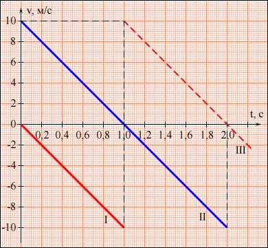 График II – случай движения тела, брошенного вертикально вверх с начальной скоростью υ0 = 10 м/с. Максимальная высота подъема h = 5 м. Тело возвращается на землю через время 2 секунды.