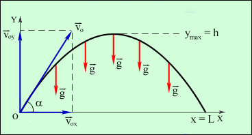 Задача о свободном падении тел тесно связана с задачей о движении тела, брошенного под некоторым углом к горизонту. Для кинематического описания движения тела удобно одну из осей системы координат направить вертикально вверх (ось OY), а другую (ось OX) - расположить горизонтально. Тогда движение тела по криволинейной траектории можно представить как сумму двух движений, протекающих независимо друг от друга – движения с ускорением свободного падения вдоль оси OY и равномерного прямолинейного движения вдоль оси OX. На рис. 1.5.2 изображен вектор начальной скорости