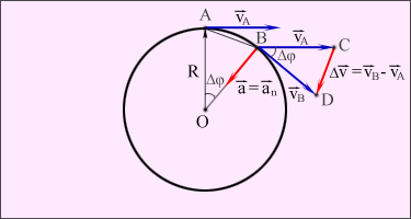 Рисунок 1.6.2. Центростремительное ускорение тела при равномерном движении по окружности. |