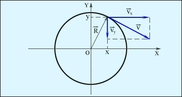 Движение тела по окружности можно описывать с помощью двух координат x и y (плоское движение). Скорость тела в каждый момент можно разложить на две составляющие υx и υy (рис. 1.6.4).