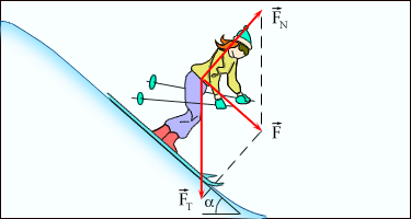 Рисунок 1.8.1. Сила – равнодействующая силы тяжести и силы нормального давления действующих на лыжницу на гладкой горе. Сила вызывает ускорение лыжника. |