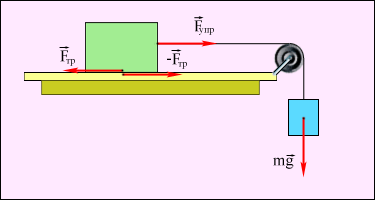 Сила трения покоя не может превышать некоторого максимального значения (F тр)max. Если внешняя сила больше (F тр)max, возникает относительное проскальзывание. Силу трения в этом случае называют силой трения скольжения. Она всегда направлена в сторону, противоположную направлению движения и, вообще говоря, зависит от относительной скорости тел. Однако, во многих случаях приближенно силу трения скольжения можно считать независящей от величины относительной скорости тел и равной максимальной силе трения покоя. Эта модель силы сухого трения применяется при решении многих простых физических задач (рис. 1.13.2).