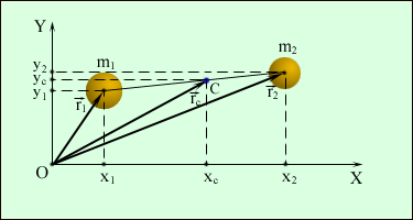 Во многих задачах рассматривается случай, когда ось вращения твердого тела проходит через его центр массы. Положение x C, y C центра масс для простого случая системы из двух частиц с массами m 1 и m 2, расположенными в плоскости XY в точках с координатами x 1, y 1 и x 2, y 2 (рис. 1.23.2), определяется выражениями: