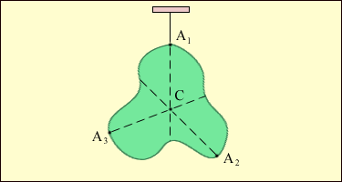 | Рисунок 1.23.3. Определение положения центра масс C тела сложной формы. A 1, A 2, A 3 точки подвеса. |