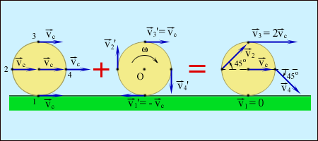 Рисунок 1.23.4. Качение колеса (3) как сумма поступательного движения (1) со скоростью и вращения (2) с угловой скоростью относительно оси O, проходящей через центр масс. |