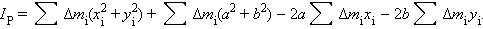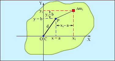 Рассмотрим сечение твердого тела произвольной формы, изображенное на рис. 1.23.6. Выберем координатную систему XY с началом координат O в центре масс C тела. Пусть одна из осей вращения проходит через центр масс C, а другая через произвольную точку P, расположенную на расстоянии d от начала координат. Обе оси перпендикулярны плоскости чертежа. Пусть Δ m i – некоторый малый элемент массы твердого тела. По определению момента инерции: