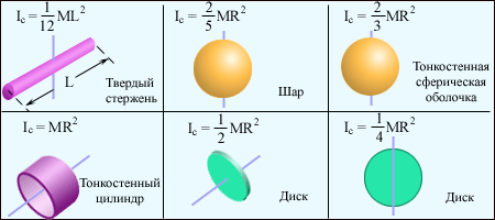 | Рисунок 1.23.7. Моменты инерции I C некоторых однородных твердых тел. |