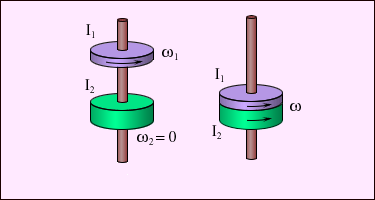 | Рисунок 1.23.9. Неупругое вращательное столкновение двух дисков. Закон сохранения момента импульса: I 1ω1 = (I 1 + I 2)ω. |