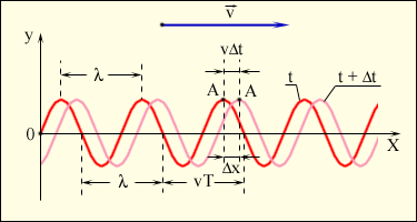 | Рисунок 2.6.4. «Моментальные фотографии» бегущей синусоидальной волны в момент времени t и t + Δ t. |
