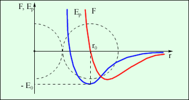 | Рисунок 3.1.2. Сила взаимодействия F и потенциальная энергия взаимодействия E p двух молекул. F > 0 – сила отталкивания, F < 0 – сила притяжения. |